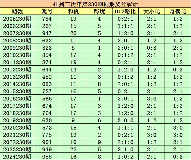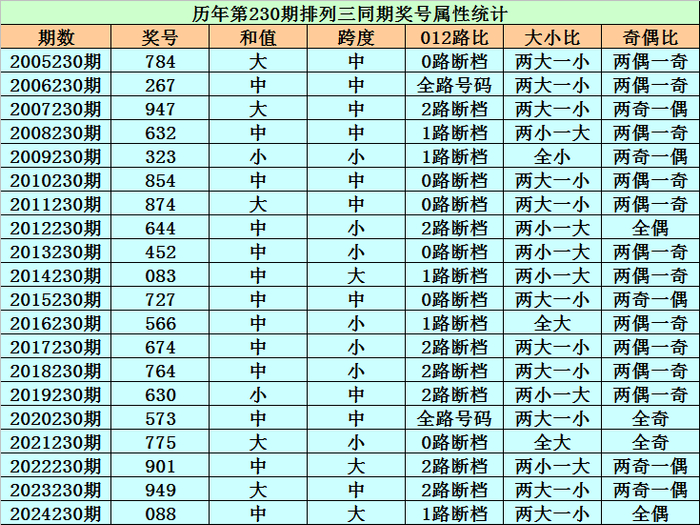 历史上第2025230期排列三已开出20期奖号了,历年同期奖号分别为:784、267、947、632、323、854、874、644、452、083、727、566、674、764、630、573、775、901、949、088,详细统计见下表: