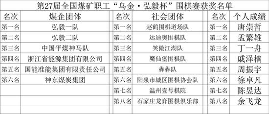 以下为第27届全国煤矿职工“乌金·弘毅杯”围棋赛获奖名单: