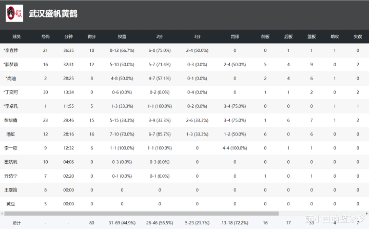 此役武汉女篮全队4人上双,李宜桦37分钟,12中8+三分4中2,拿到18分1篮板1助攻;
