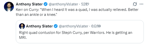 勇士队记Slater进一步报道,勇士官方表示,库里右腿股四头肌挫伤,勇士队表示他将接受MRI检查。