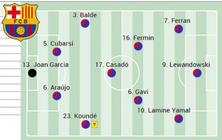 中场区域,卡萨多可能回归防守型后腰位置,加维进入首发阵容,费尔明出任进攻型中场,让佩德里、奥尔莫获得休息,德容则可能在下半场替补出场。