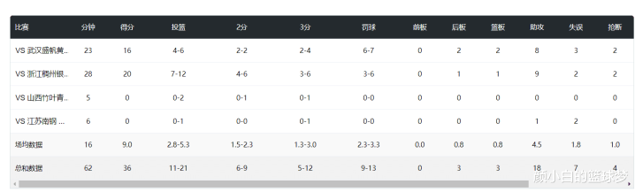 全场比赛,王思雨16分6助攻2抢断;韩旭26分6篮板1助攻1抢断;贾赛琪11分3篮板3助攻;高颂16分9篮板4助攻;