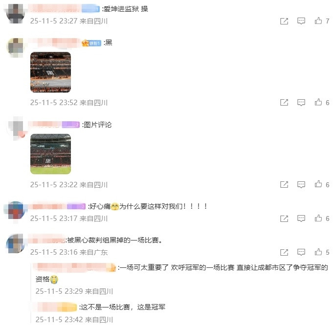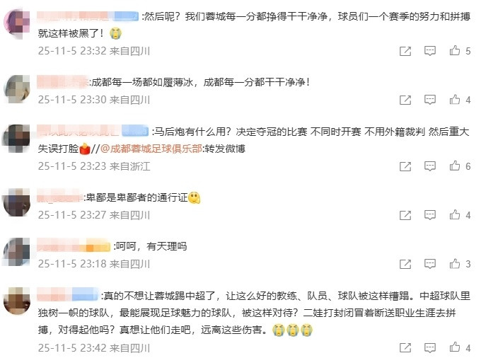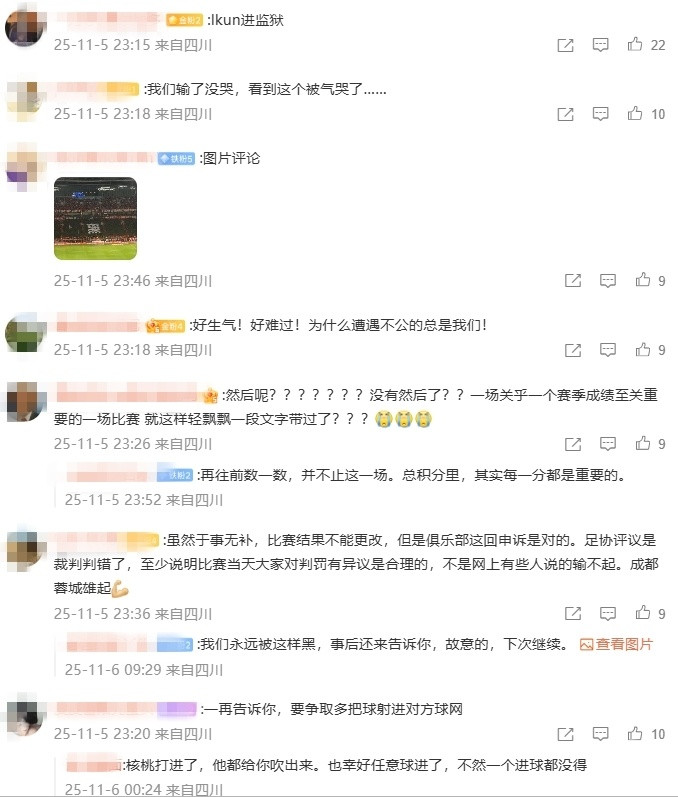 成都球迷愤怒写道:“那场比赛输了我们没哭,但看到这个真的被气哭了!”:“好生气好难过!为什么遭遇不公待遇的总是我们?”:“不想让蓉城再踢中超了!这么好的教练和球员,却被黑心的裁判这么糟蹋!”
